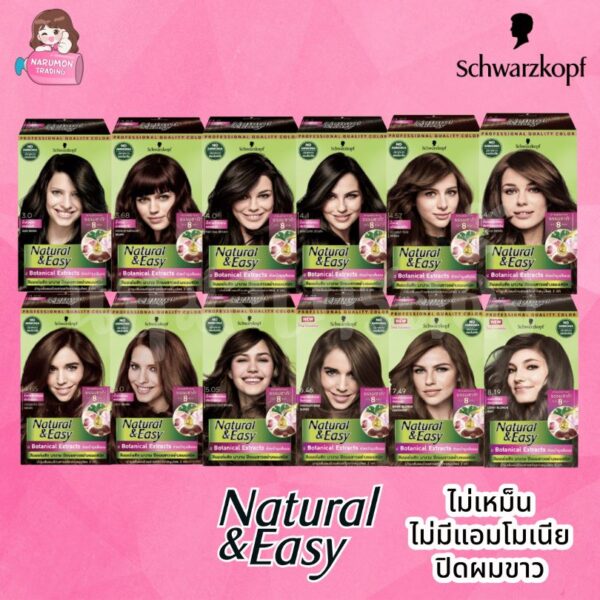 ครีมเปลี่ยนสีผมเนเชอรัล แอนด์ อีซี่ สูตรปราศจากแอมโมเนีย สีผมเด่นชัด ยาวนาน ปิดผมขาวได้อย่างแนบสนิท พร้อมการบำรุงเส้นผม ด้วยสารสกัดจากธรรมชาติหลายชนิด เช่น สารสกัดจากลิ้นจี่ โกจิเบอร์รี่ รากไม้โชวูที่ช่วยรักษาสีผมให้คงความดำเงางามแข็งแรง โสมตังกุย แปะก๊วย และสารสกัดจากพืชธรรมชาติอีกหลายชนิด และช่วยบำรุงเส้นผมอย่างล้ำลึก เพื่อผมนุ่มสลวยเงางาม ดูสุขภาพดี ให้ประกายสีเด่นชัดอย่างเป็นธรรมชาติ